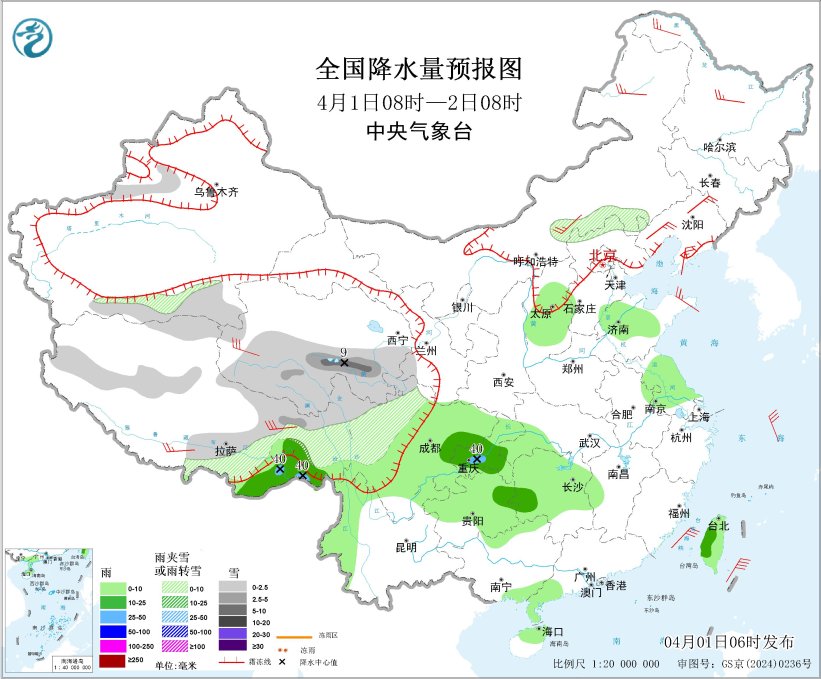 4月1日08時至2日08時,西藏東部和南部、青海南部和西部、川西高原北部、新疆南疆盆地、內蒙古東部、河北北部等地部分地區(qū)有小到中雪或雨夾雪,其中,青海南部等地局部地區(qū)有大雪(5~9毫米)。西藏東南部、西南地區(qū)東部、江南西部、山西中部、山東中北部、江蘇大部、廣西北部和東南部沿海、廣東西南部、海南島北部、臺灣島等地部分地區(qū)有小到中雨,其中,西藏東南部、重慶西南部等地局部地區(qū)有大雨(25~40毫米)。內蒙古中東部、黑龍江中北部、遼東半島、山東半島、西藏東部和南部、青海西部等地部分地區(qū)有4~6級風;渤海、東海大部海域、臺灣海峽、臺灣以東洋面、巴士海峽將有5~6級風、陣風7級。