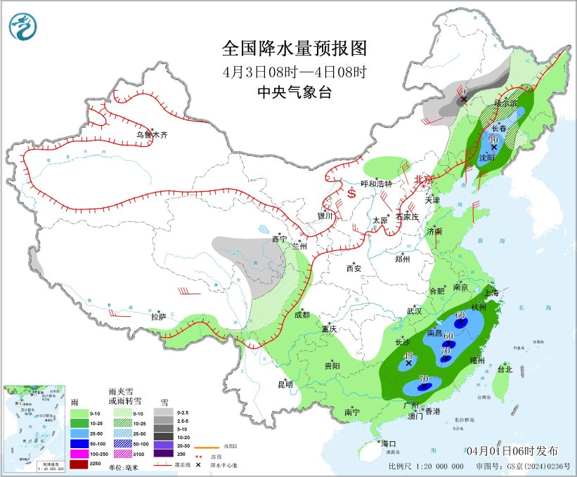 4月3日08時至4日08時,內蒙古東北部、黑龍江中西部、吉林中西部、青海東部和南部、川西高原北部等地部分地區(qū)有小到中雪或雨夾雪,其中,內蒙古東北部、黑龍江西南部等地部分地區(qū)有大雪(5~9毫米)。遼寧大部、江南大部、華南北部和東部等地部分地區(qū)有中到大雨,其中,江西東部、浙江西南部、福建西部、廣東北部等地部分地區(qū)有暴雨(50~70毫米)。內蒙古大部、遼寧大部、山西大部、河北大部、山東半島、陜西北部、西藏南部等地部分地區(qū)有4~6級風,西藏東部部分地區(qū)有6~7級風;渤海、渤海海峽、黃海大部海域、東海大部海域、臺灣海峽、臺灣以東洋面、北部灣將有6~7級風、陣風8~9級。