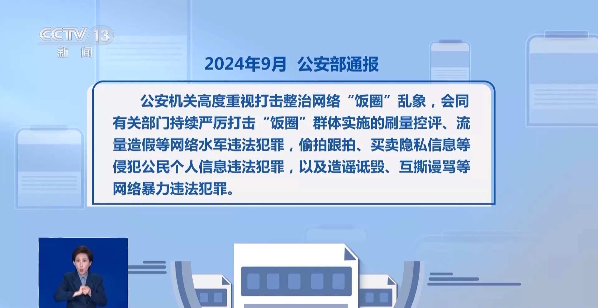 2024年9月,公安部通報(bào),公安機(jī)關(guān)高度重視打擊整治網(wǎng)絡(luò)“飯圈”亂象,會(huì)同有關(guān)部門持續(xù)嚴(yán)厲打擊“飯圈”群體實(shí)施的刷量控評(píng)、流量造假等網(wǎng)絡(luò)水軍違法犯罪,偷拍跟拍、買賣隱私信息等侵犯公民個(gè)人信息違法犯罪,以及造謠詆毀、互撕謾罵等網(wǎng)絡(luò)暴力違法犯罪。
