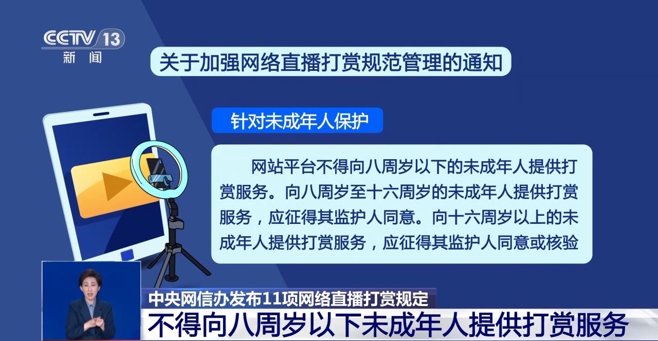 中國社會科學(xué)院大學(xué)互聯(lián)網(wǎng)法治研究中心主任 劉曉春:這個通知的發(fā)布主要針對的還是直播打賞行業(yè)存在的一系列的亂象,特別是未成年人保護(hù)這一塊,未成年人他在看直播的時候的打賞通常是跟他自己的認(rèn)知能力和判斷能力不相符的,那么特別是會出現(xiàn)這種非理性的,特別是高額的打賞,那么這一塊平臺和主播都可能存在引導(dǎo)和誘導(dǎo)的行為,這一類亂象也是比較突出的。