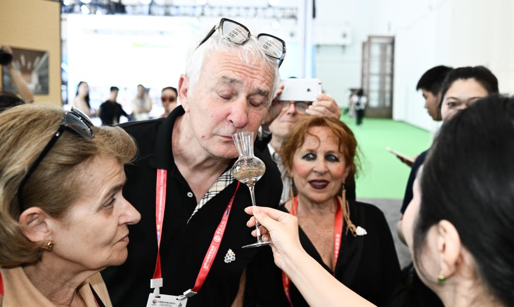4月13日,觀眾在第六屆消博會(huì)主會(huì)場(chǎng)品鑒沉香。新華社記者 楊冠宇 攝