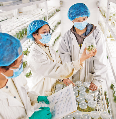 河南商丘睢縣城關(guān)鎮(zhèn)袁莊村,工作人員在實驗室內(nèi)查看草莓組培苗生長情況。