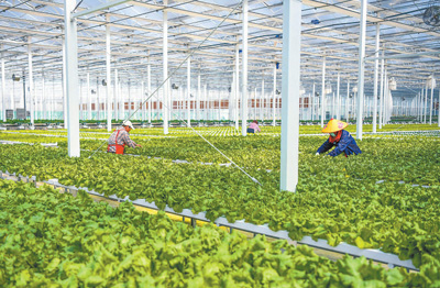 江蘇宿遷經(jīng)濟技術(shù)開發(fā)區(qū)南蔡數(shù)字農(nóng)業(yè)產(chǎn)業(yè)園溫室大棚里,村民在對蔬菜秧苗進行管護作業(yè)。