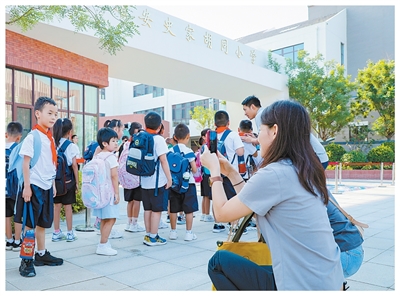 雄安史家胡同小學(xué)校門口,家長在送孩子上學(xué)。