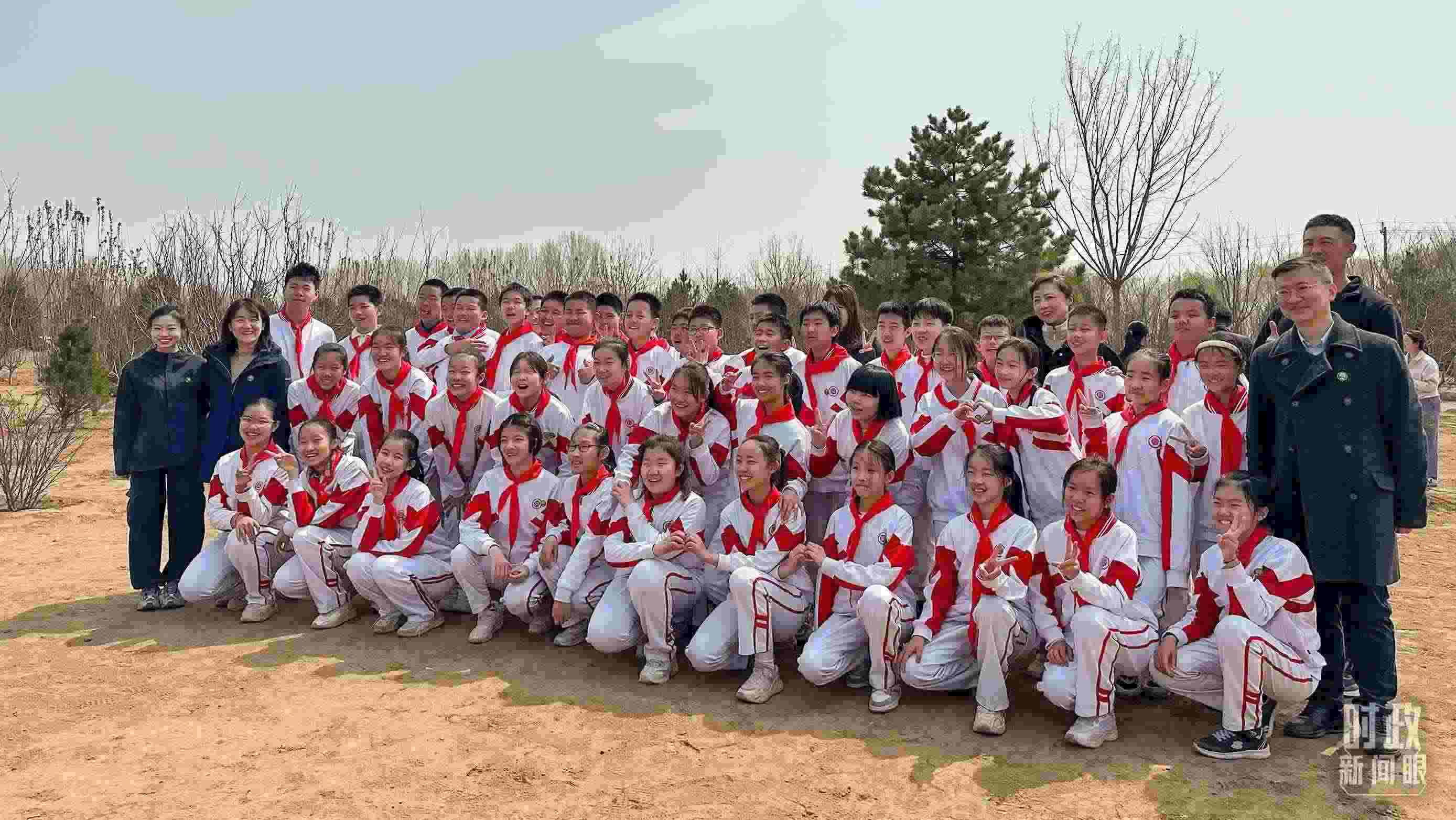 △參加植樹(shù)的少先隊(duì)員們合影留念。(總臺(tái)央視記者盧心雨拍攝)