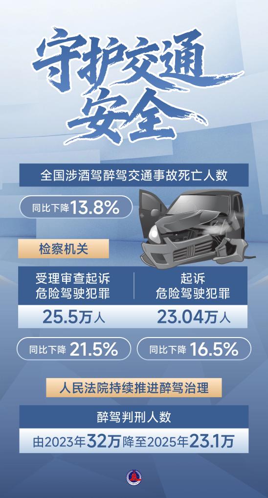 最高法報告指出,辦理醉駕刑事案件意見出臺后,判刑人數(shù)由2023年32萬降至2025年23.1萬,因酒駕造成交通事故及致死、致傷數(shù)量均有下降。同時,明確“駕駛?cè)俗砭坪髥⒂幂o助駕駛功能仍應(yīng)承擔刑事責任”。