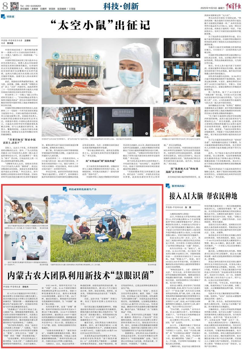 2025年11月5日,《中國青年報》第8版刊發(fā)題為《內(nèi)蒙古農(nóng)大團隊利用新技術(shù)“慧眼識菌”》的文章,報道了在10月28日福建泉州舉行的第三屆全國博士后創(chuàng)新創(chuàng)業(yè)大賽總決賽上,來自內(nèi)蒙古農(nóng)業(yè)大學(xué)博士后馬騰團隊的參賽項目“慧眼識菌——數(shù)據(jù)賦能中國菌邁向產(chǎn)業(yè)強國之路”,在創(chuàng)新組的農(nóng)業(yè)與現(xiàn)代食品賽道獲得金獎。