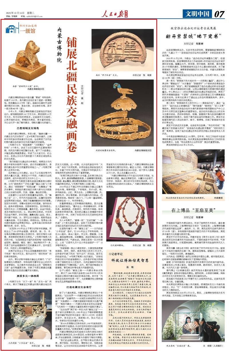 12月16日,《人民日報海外版》刊發(fā)《內(nèi)蒙古博物院 鋪展北疆民族交融畫卷》,報道內(nèi)蒙古自治區(qū)首個國家一級博物館今年6月搬遷至新館后開館試運行。新館建筑面積14.7萬平方米,展覽面積3.9萬平方米,均為舊館的兩倍多。這座城市文化地標,以更開闊的空間、更精彩的展覽、更豐富的體驗,為公眾打開一扇了解內(nèi)蒙古、領略北疆文化的窗口。