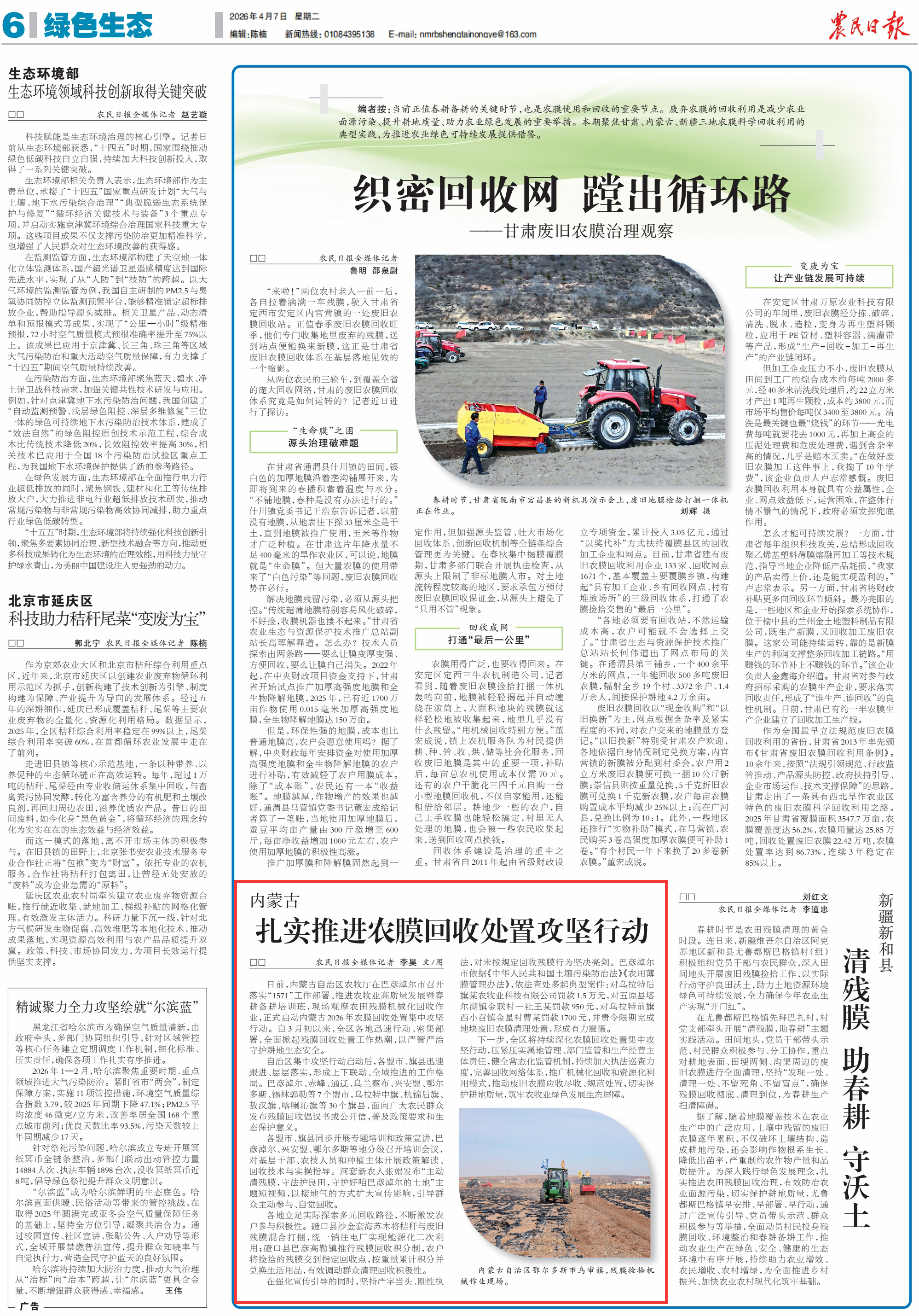 2026年4月7日,《農民日報》第6版刊發(fā)題為《內蒙古扎實推進農膜回收處置攻堅行動》的文章,報道了日前,內蒙古自治區(qū)農牧廳在巴彥淖爾市召開落實“1571”工作部署、推進農牧業(yè)高質量發(fā)展暨春耕備耕培訓班,現(xiàn)場觀摩農田殘膜機械化回收作業(yè),正式啟動內蒙古2026年農膜回收處置集中攻堅行動。自3月初以來,全區(qū)各地迅速行動、密集部署,全面掀起殘膜回收處置工作熱潮,以嚴管嚴治守護耕地生態(tài)安全。