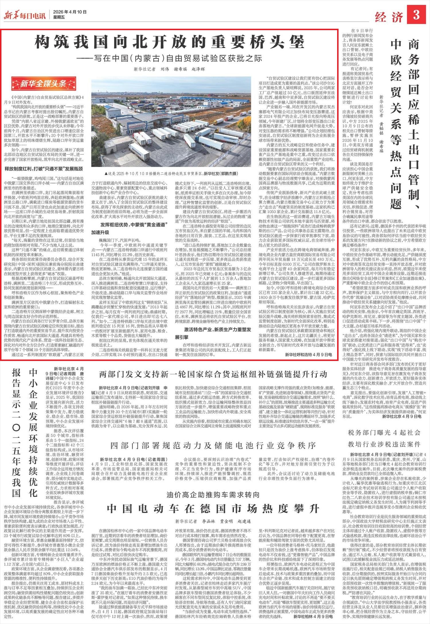 2026年4月10日,《新華每日電訊》第3版刊發(fā)題為《構(gòu)筑我國(guó)向北開(kāi)放的重要橋頭堡——寫(xiě)在中國(guó)(內(nèi)蒙古)自由貿(mào)易試驗(yàn)區(qū)獲批之際》的文章,報(bào)道了《中國(guó)(內(nèi)蒙古)自由貿(mào)易試驗(yàn)區(qū)總體方案》4月9日對(duì)外發(fā)布。內(nèi)蒙古自貿(mào)試驗(yàn)區(qū)的建設(shè),填補(bǔ)了我國(guó)北部沿邊地區(qū)自貿(mào)試驗(yàn)區(qū)布局的關(guān)鍵一環(huán),進(jìn)一步完善了國(guó)家開(kāi)放格局,筑牢向北開(kāi)放戰(zhàn)略支點(diǎn)。