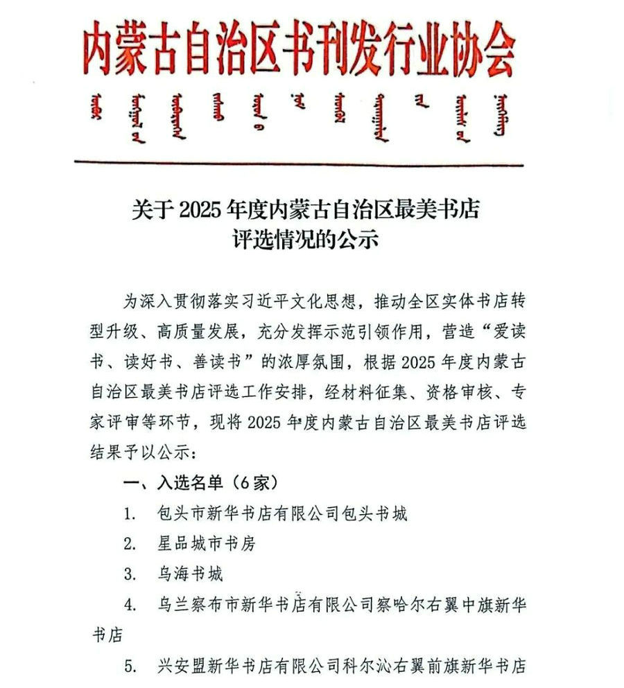 為深入貫徹落實(shí)習(xí)近平文化思想,推動(dòng)全區(qū)實(shí)體書(shū)店轉(zhuǎn)型升級(jí)、高質(zhì)量發(fā)展,充分發(fā)揮示范引領(lǐng)作用,營(yíng)造“愛(ài)讀書(shū)、讀好書(shū)、善讀書(shū)”的濃厚氛圍,根據(jù)2025年度內(nèi)蒙古自治區(qū)最美書(shū)店評(píng)選工作安排,經(jīng)材料征集、資格審核、專(zhuān)家評(píng)審等環(huán)節(jié),現(xiàn)將2025年度內(nèi)蒙古自治區(qū)最美書(shū)店評(píng)選結(jié)果予以公示: