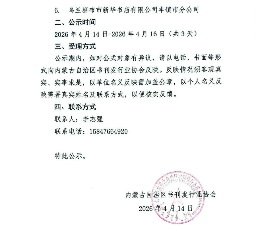 公示期內(nèi),如對(duì)公式對(duì)象有異議,請(qǐng)以電話、書(shū)面等形式向內(nèi)蒙古自治區(qū)書(shū)刊發(fā)行業(yè)協(xié)會(huì)反映。反映情況須客觀真實(shí)、實(shí)事求是,以單位名義反映需加蓋公章,以個(gè)人名義反映需署真實(shí)姓名及聯(lián)系方式,以便核實(shí)反饋。